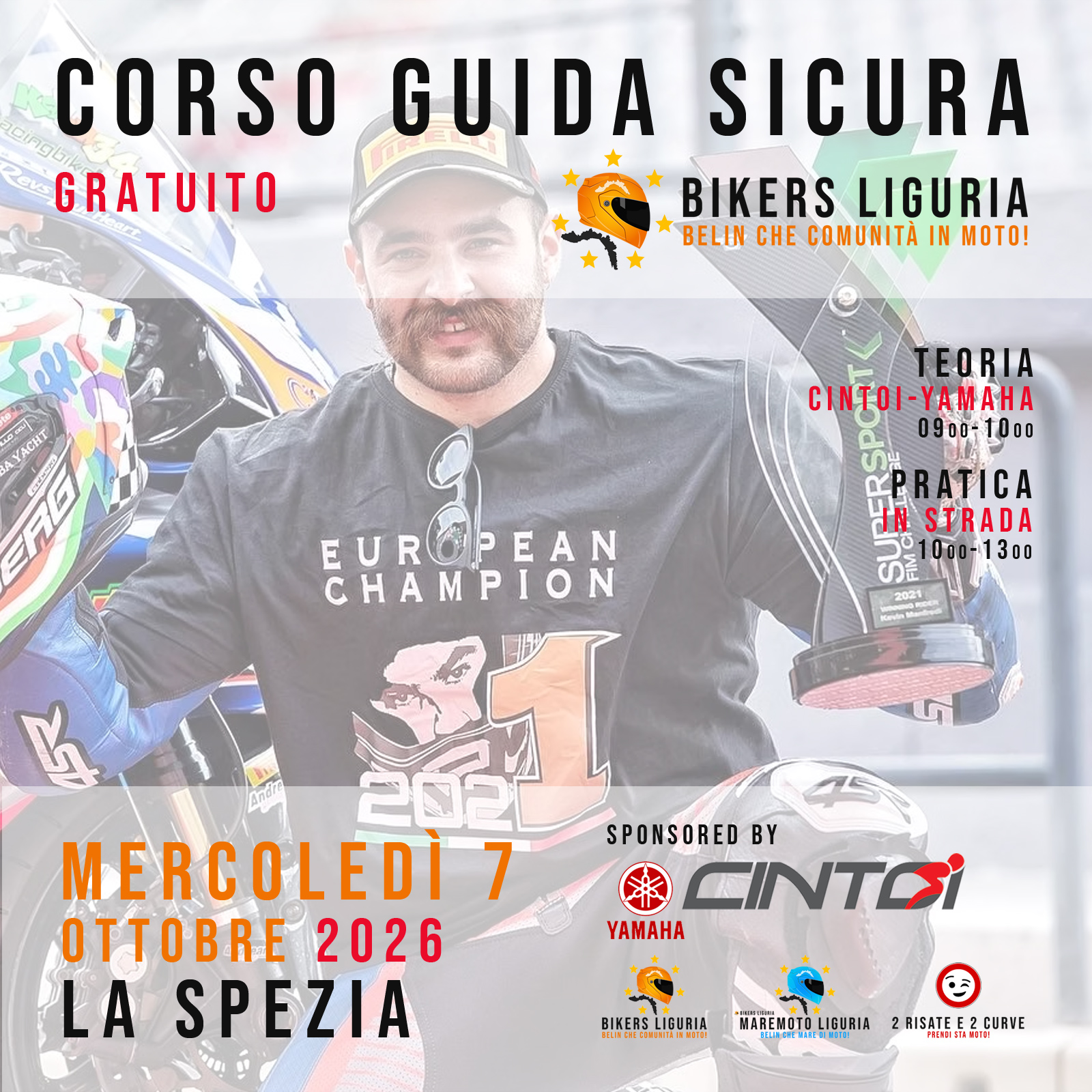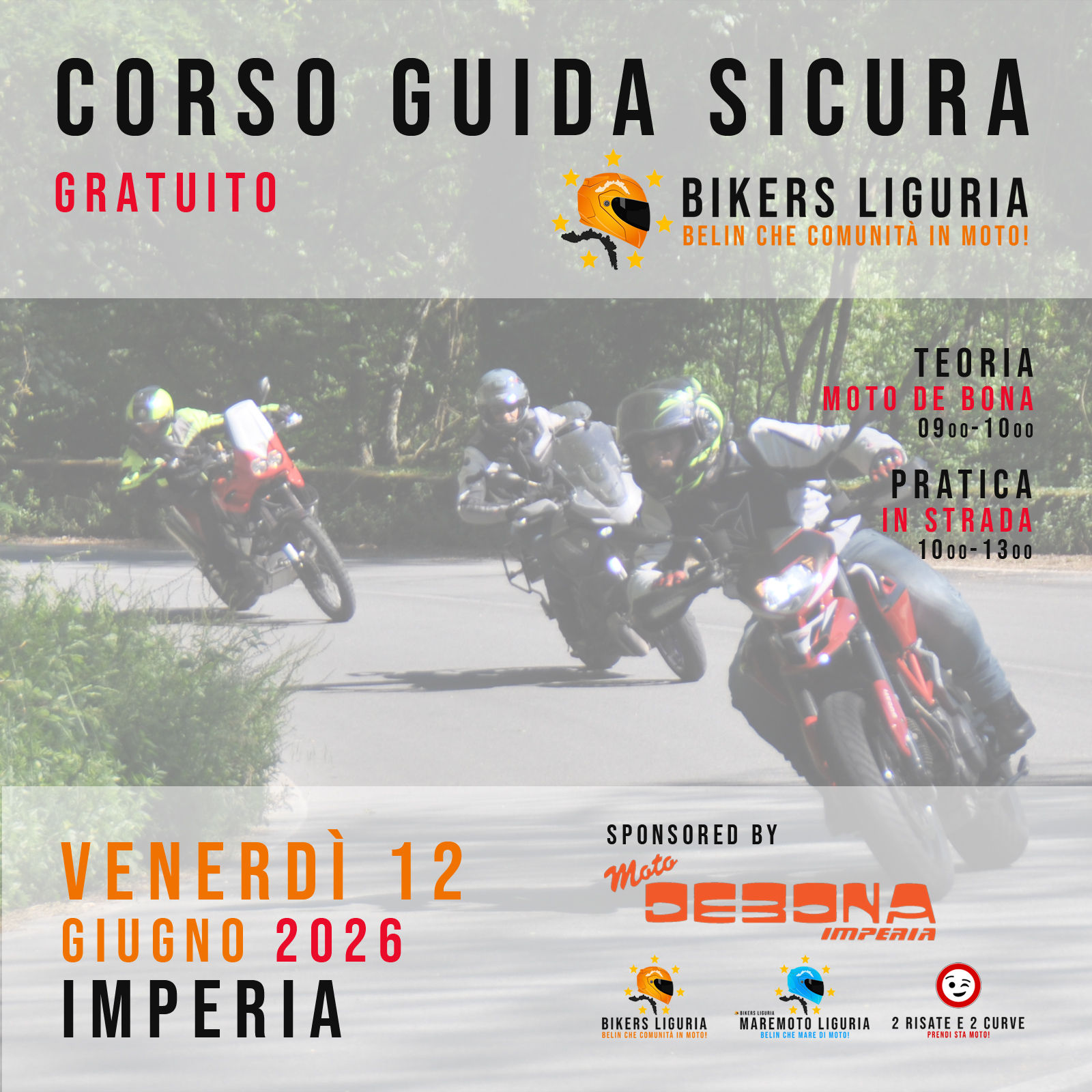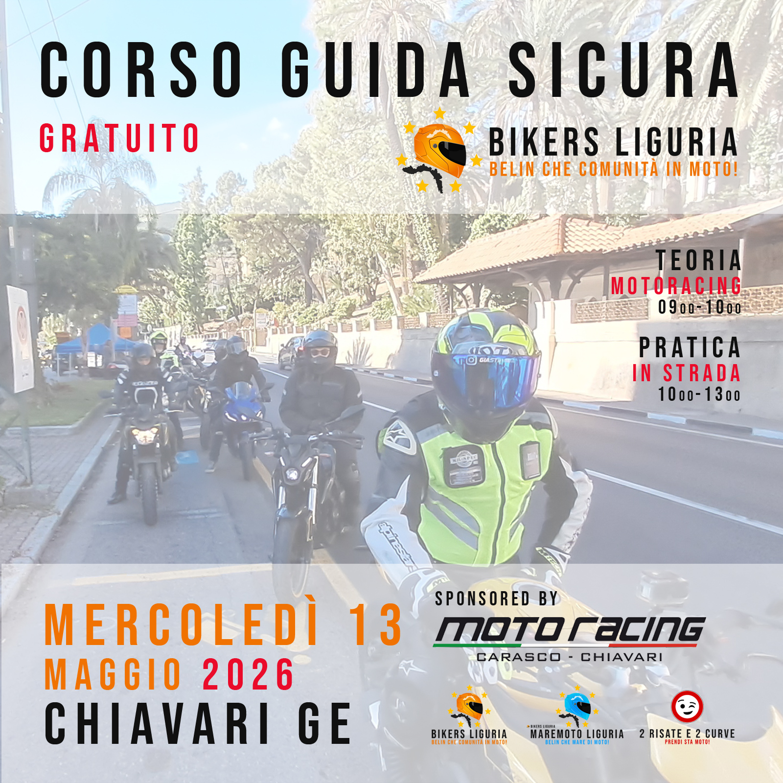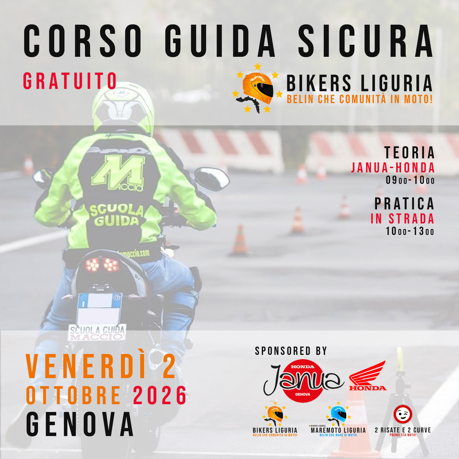 Corso di guida sicura gratuito per 5 membri della community, tenuto da AUTOSCUOLA MACCIÒ e sponsorizzato da JANUA - HONDA. Teoria presso il concessionario e sessione di pratica nell'entroterra di GENOVA. Corso aperto a tutti i brand.